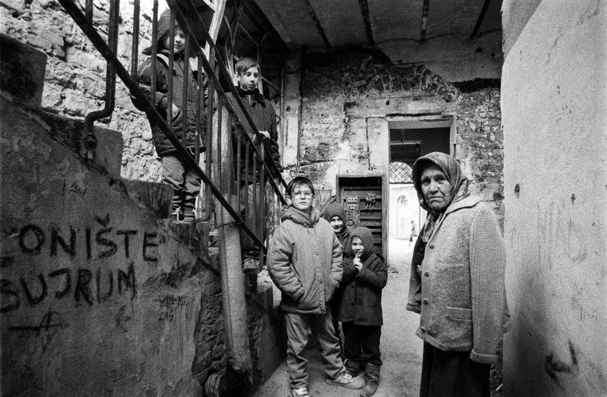 Displaced residents find shelter in the basement of a heavily damaged building. Thousands of Bosnian Muslim women and children were expelled from the west side of Mostar by Bosnian Croat forces and thousands more fled the frontline areas north and south of the city.