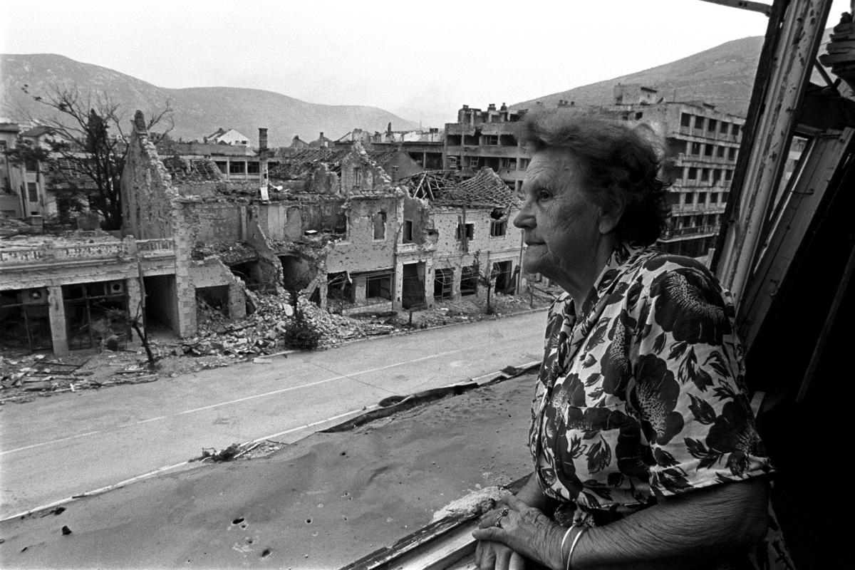 An elderly women looks out of her apartment window after the cease-fire, She and her husband refused to leave their apartment although they were just meters from the frontline and were the only ones left living in the building during the fighting.