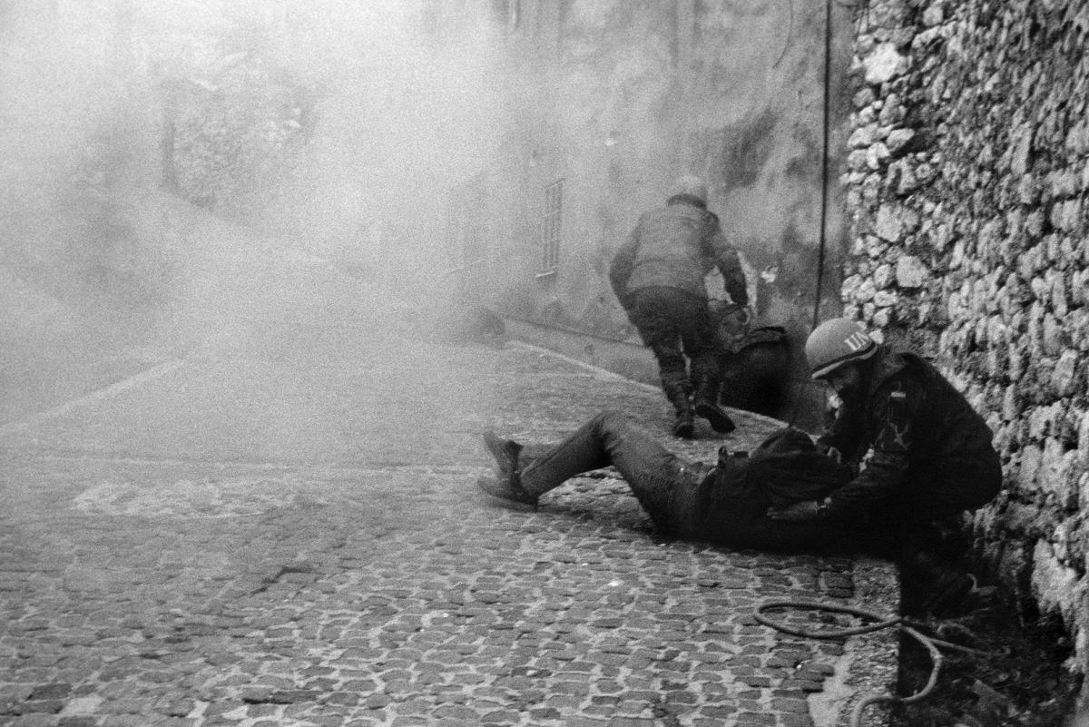 Under the cover of smoke grenades the young UNICEF woman jumps to safety as the Spanish UN soldiers run to rescue the sniper victim.