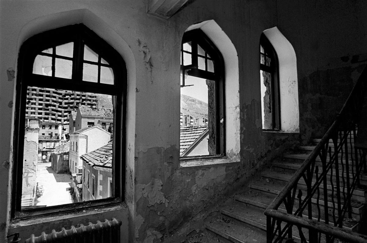A view out the windows from inside the badly damaged Mostar Bathhouse, which opened in 1914.