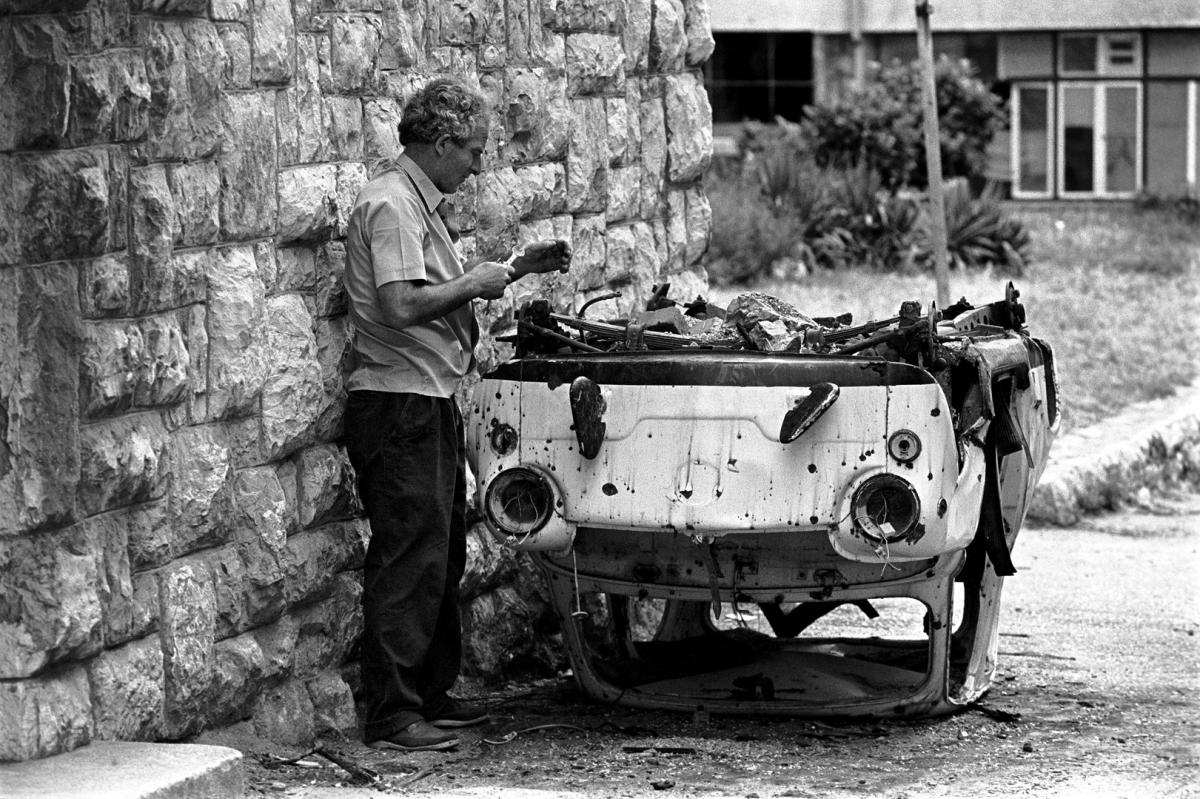 A Bosniak man removes some spare parts from a destroyed car in east Mostar.
