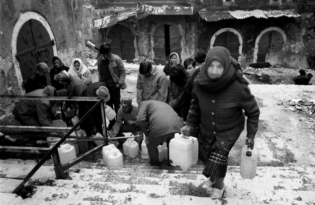 Odolijevajući ne samo hladnoći, nego i snajperskoj i minobacačkoj vatri, stanovnici istočnog mostara skupljaju vodu na distribucijskom mjestu nedaleko Starog mosta.