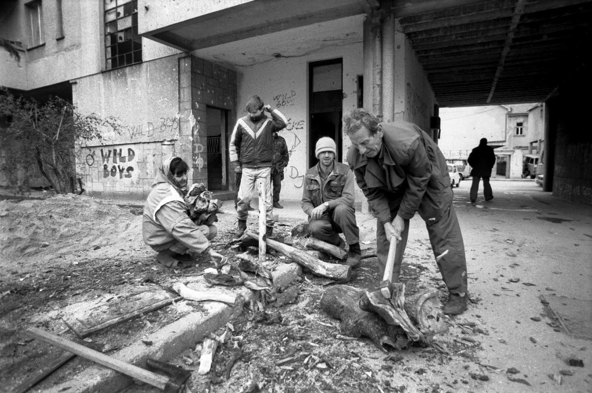 Obitelj cijepa drvo za potpalu pred svojom stambenom zgradom. Bez struje u enklavi, jedini način kuhanja bio je na pećima na drvo.