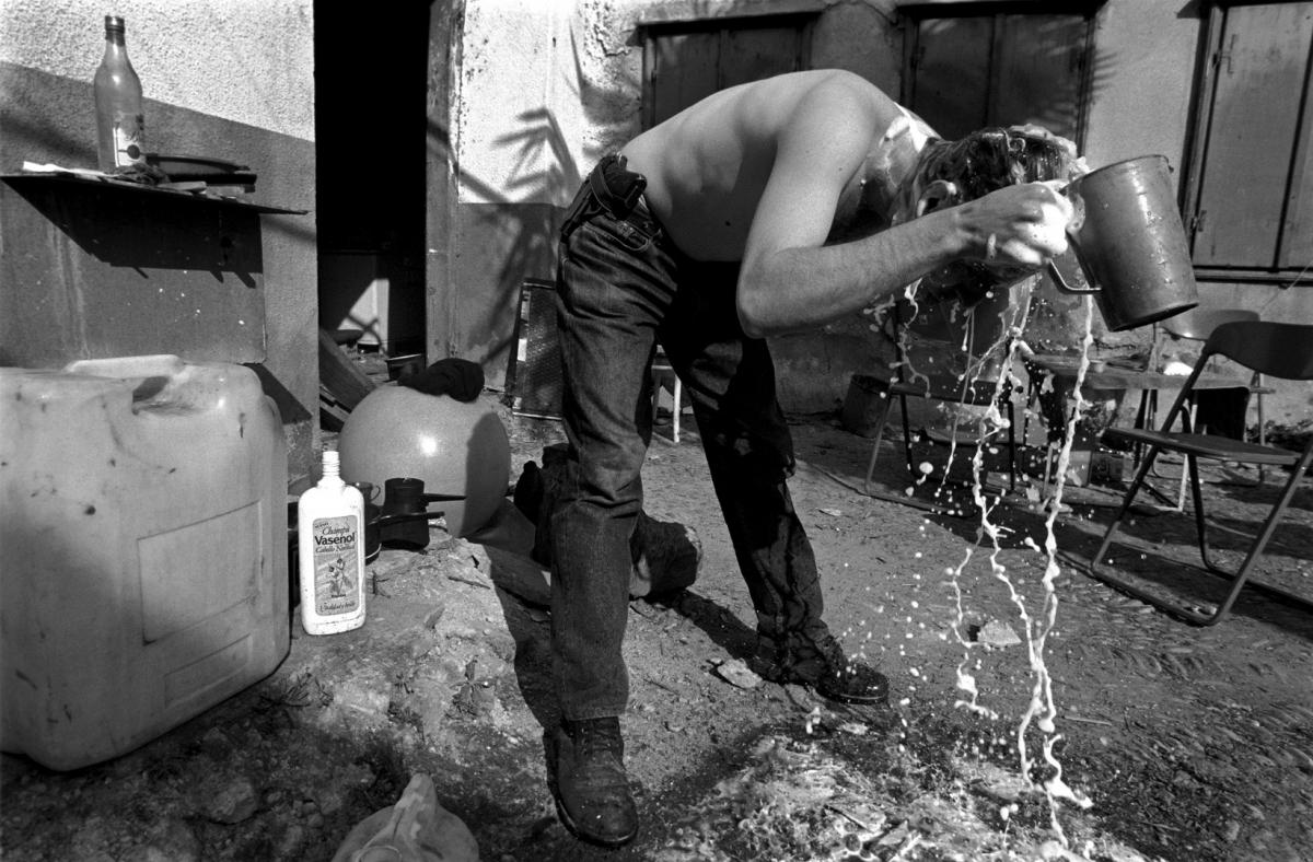 Vojnik pere kosu u vrtu stambene kuće u istočnom Mostaru.