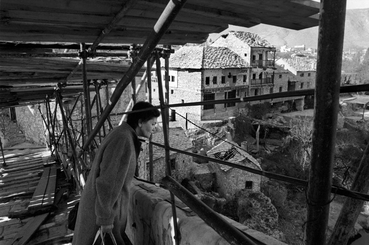 Stanovnik Mostara gleda na rijeku Neretvu koja teče ispod Starog Mosta. Drvene daske podignute kako bi zaštitile pješake od snajperske vatre tijekom opsade Mostara od strane Jugoslavenske Armije 1992. još nisu uklonjene.