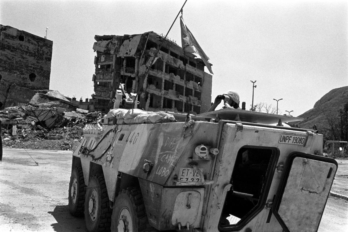 Oklopno vozilo španjolskih snaga UN-a tijekom prekida vatre potpisanog 23. veljače 1994. motri na prvu liniju bojišnice na Bulevaru.