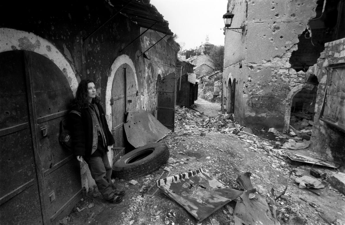 Mlada bosanska žena pregledava ruševine stare turske četvrti na istočnoj obali Starog mosta nedugo nakon njegovog uništenja.